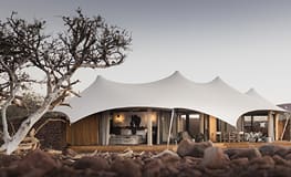 Desert Rhino Camp is a luxury tented camp situated to optimize the exploring the wild and remote Damaraland. You'll have the pleasure to be in company of dedicated conservationists and expert trackers. The camp has eight large Meru-style tents built on elevated platforms with private verandahs and en suite facilities including dual hand basins and walk-in shower.