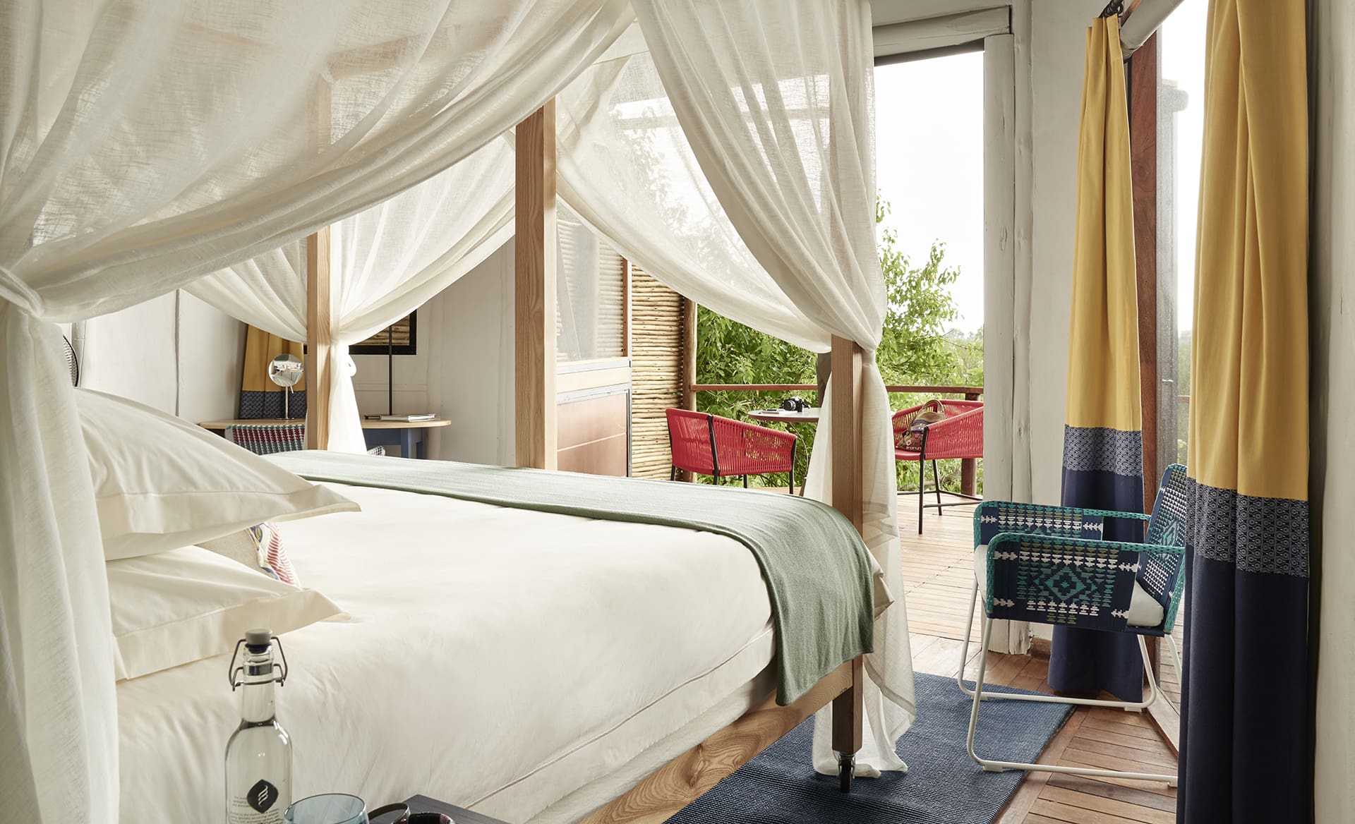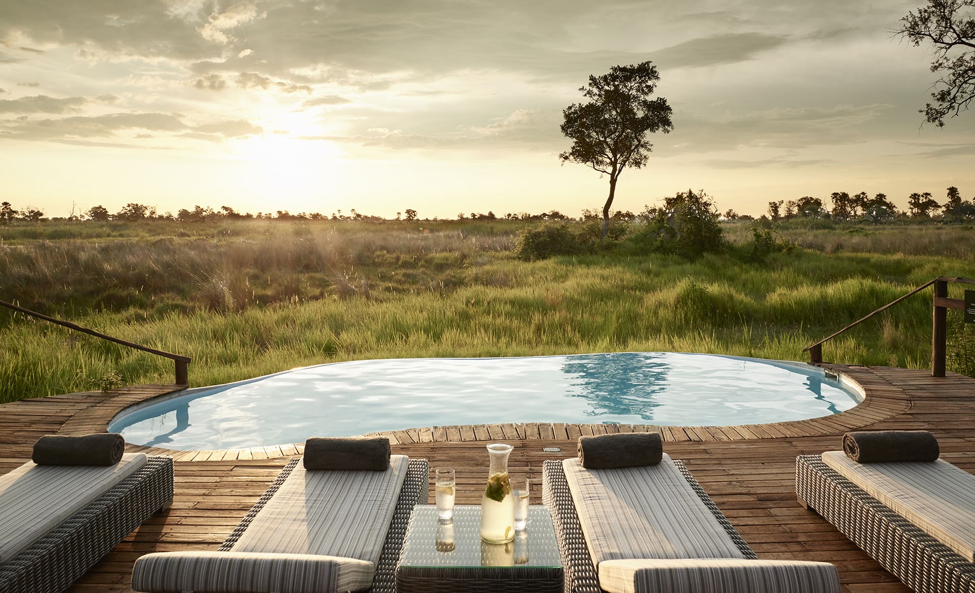 Each luxurious suite features a spacious en suite bedroom with four-poster beds that are fully mobile, giving you the choice of sleeping inside or out under the stars in a “sky bed”. With your own private outdoor deck, you may enjoy some yoga or choose to relax in the “star bath” enjoying the sounds of nature. The whole camp features wide wooden walkways that connect and surround the main areas and suites and guests will enjoy viewing wildlife from the ideally positioned swimming pool.