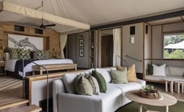 Chitabe Camp sits in a private concession that borders the Okavango Delta's Moremi Reserve. Eight elevated, Meru-style guest tents are en suite and each includes a fan, lounge area, mosquito nets, outside shower, safe and a tea-coffee station. Enjoy relaxing on your private verandah. An elevated walkway connects the tents to the main area which has a comfortable lounge, bar, expansive deck and swimming pool.