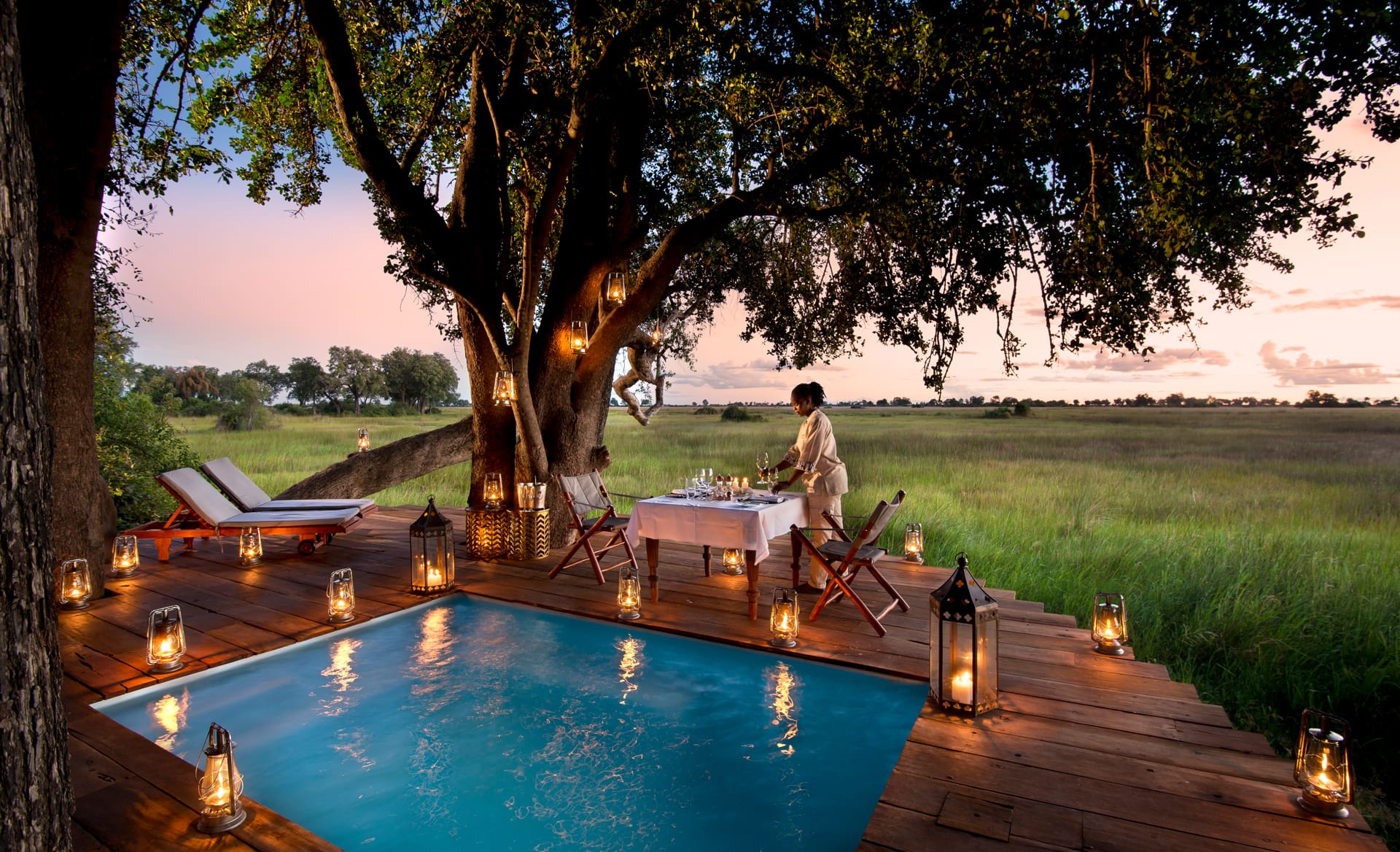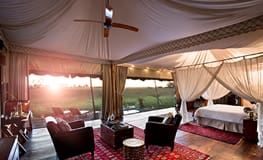 Duba Plains has six luxury tents, including a two-bedroom tented suite, each with en suite bathrooms, inside-outside showers and sumptuous bathtub. Each tent overlooks the bust and has an expansive deck with an inviting sala bed and private plunge pool. The main lounge area includes a welcoming bar, wine cellar, interactive kitchen, library, dining room and fire pit. Activities include day and night game drives in open vehicles, guided walks and boating (subject to water levels).