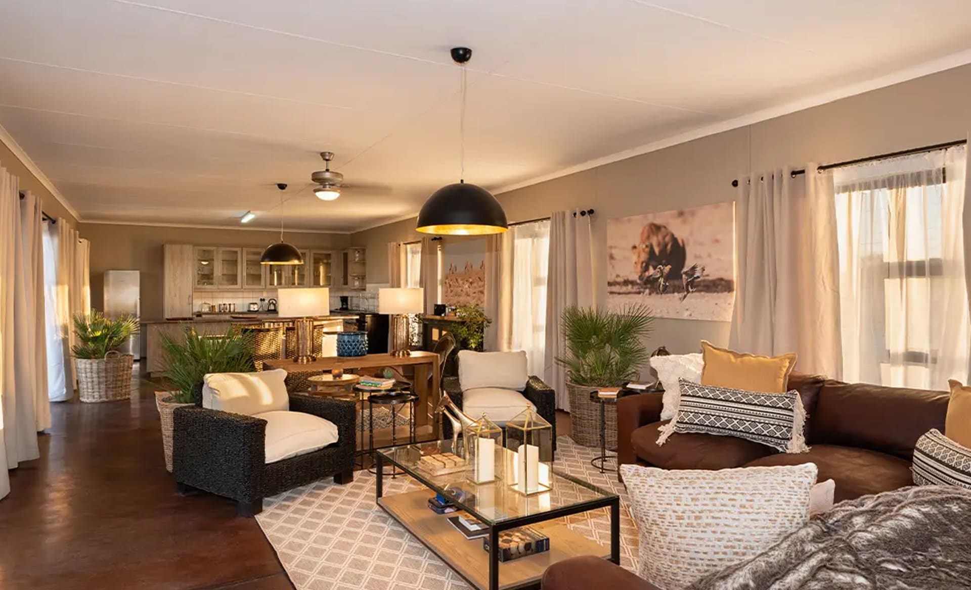 Between private game activities, relax on the large, wraparound veranda which is just meters from the active waterhole. Enjoy the swimming pool, morning and afternoon game drives, a barbeque area and fully-fenced garden.