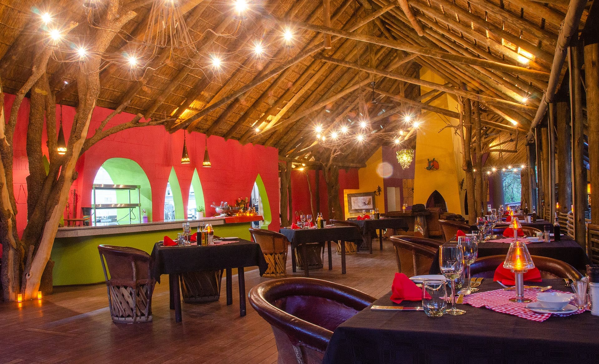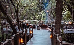 Jaci’s Tree Lodge consists of eight “tree houses” built among the trees and constructed 19 feet above the ground. The thatched tree houses include an enormous stone bath and outdoor “jungle shower”, private deck and wooden walkways connect you to the main lodge area, which overlook Madikwe Game Reserve's Marico River. The main building features a colorful bar and lounge area separated from the dining room by a four-sided fireplace. Activities include morning and night game drives as well as guided bush walks. Between game viewing activities, there is a refreshing pool overlooking the river.