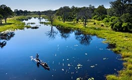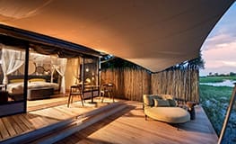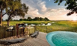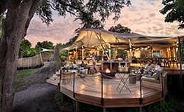 Khwai Leadwood is located on the eastern border of Moremi Reserve, on the banks of a lagoon flowing into the Khwai River. The camp preserves the romance and traditions of a traditional safari camp. It features six canvas tents each with en suite bathrooms with flush toilet and indoor-outdoor showers and private balconies overlooking the lagoon. The main area has a library, sitting area, bar and dining tent and has views of the river. Cool off in the plunge pool and expansive deck area. Activities include morning and night game drives and guided walks