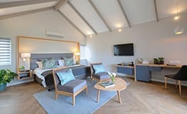 A very comfortable hotel, with air-conditioning, at least one restaurant and bar, and most with a swimming pool.