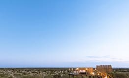 Tau Pan Camp is located in the Central Kalahari Game Reserve, built on a sand ridge overlooking the permanent Tau Pan waterhole and the endless Kalahari horizon. Guests are accommodated in eight custom-built desert tents under thatch, each with ceiling fan, en suite facilities and an outdoor shower. The main area, connected by a sand pathway, consists of dining room, lounge area and a viewing deck. The solar-powered camp also offers a swimming pool, library and curio shop. Activities include game drives in open 4x4 vehicles and guided walks.