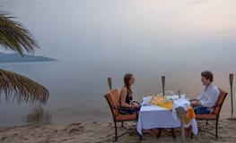 The Lake Kivu Serena Hotel islocated in the Rwandan border town of Gisenyi, overlooking a sandy beach of Lake Kivu. Lake Kivu is an inland sea and 1,000 square miles volcanic lake which borders the Congo to the west and features a dramatic mountain coastline. Here the fisherman plies the water in dugout canoes unchanged in design for centuries, while colorfully dressed ladies smoke traditional wooden pipes and troubadours strum sweetly on traditional guitars.