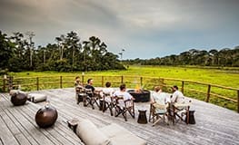 Lango Camp, architecturally inspired by Pygmy design and building materials, includes six en suite rooms with views overlooking the Lango Bai. Guests gather at the main area, dining room and fire pit. Forest buffalo, elephant, western sitatunga, and large flocks of green pigeon and grey parrot are frequently seen from the deck. The camp is entirely solar-powered. Activities include boating and canoeing along the Lekoli River, walking safaris through the Lango Bai system, and night and day game drives in the nearby savannah.