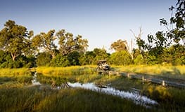 Activities include morning and night game drives with four passengers per vehicle. During the seasonal floods, mokoro rides are also available.