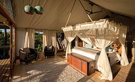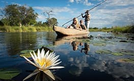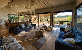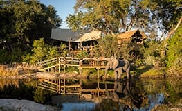 Little Tubu is an intimate camp in the Jao Concession with just three tents. Each has a small, private deck in front, en suite bathroom and private outdoor shower. The main lounge area has a unique bar built into a water berry tree and there is an expansive deck overlooking the floodplains. Activities at Little Tubu include day and night game drives in open 4x4 vehicles. When the Okavango's annual flood is at its highest (normally May to late September), boating, fishing and mokoro trips are also offered. A variety of habitats ensures diverse and interesting game viewing. Wildlife seen here includes elephant, lion, zebra, red lechwe, giraffe, tsessebe, wildebeest as well as kudu, impala, leopard and bushbuck.