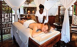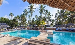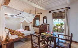Mapenzi Beach Club is located an hour from the airport on the east coast of Zanzibar. This first-class resort is set in a tropical paradise of swaying palms and bright bougainvillea trees. Eighty seven charming bungalows, each decorated with traditional East Africa decor and a large veranda, offer lovely views of the ocean. Two restaurants and three bars to choose from as well as windsurfing and other beach activities are offered here. Scuba diving is available through a local dive operator and can be booked on site.