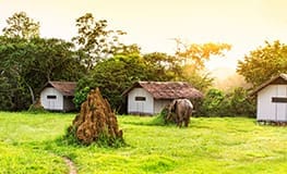Located inside Odzala-Kokoua National Park, Mboko Camp overlooks the Lekoili River. The camp features 12 cabins, including 2 family units, each with en suite bathroom and mosquito draped beds. Each cabin has a deck with comfortable lounge chairs to relax and listen to the tranquil river. Forest buffalo and elephant are common visitors to the camp.