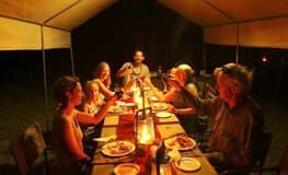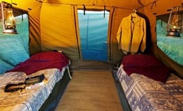 Accommodations include Meru style tents with an en-suite bathroom and a covered area in front of the tent. The tents are fitted with solid base camp beds made up with mattresses, sheets, duvets and pillows. The en suite bathroom features a long drop toilet and bucket shower. Showers can be ordered as hot, cold or warm and the water is heated in a bucket on the fire. Each tent has an oil/paraffin lamp on the veranda and in the bathroom and within the tent itself, a LED rechargeable camp light is supplied along with a side table in the sleeping area and in the bathroom.