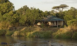 Ngare Serian is located in the Mara North Conservancy, a partnership with the local Maasai promoting the environment and wildlife. The 74,000 acre game concession features the Big Five and is in prime position for the annual migration of the wildebeest. The intimate camp is accessed by a rope bridge. Four tents are built on wood platforms and are decorated with colonial style furniture. The bedroom area is fitted with canopied bed, writing desk and comfortable lounge chair. The private bathroom includes a shower and flush toilet. The camp can be booked on an exclusive basis for families or small groups.