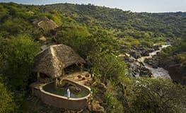 Sabuk is a beautiful stone and thatch, five cottage private retreat on the banks of the Ewaso Nyiro River in northern Laikipia. Each rondavel has private verandahs facing out over the river gorge below.