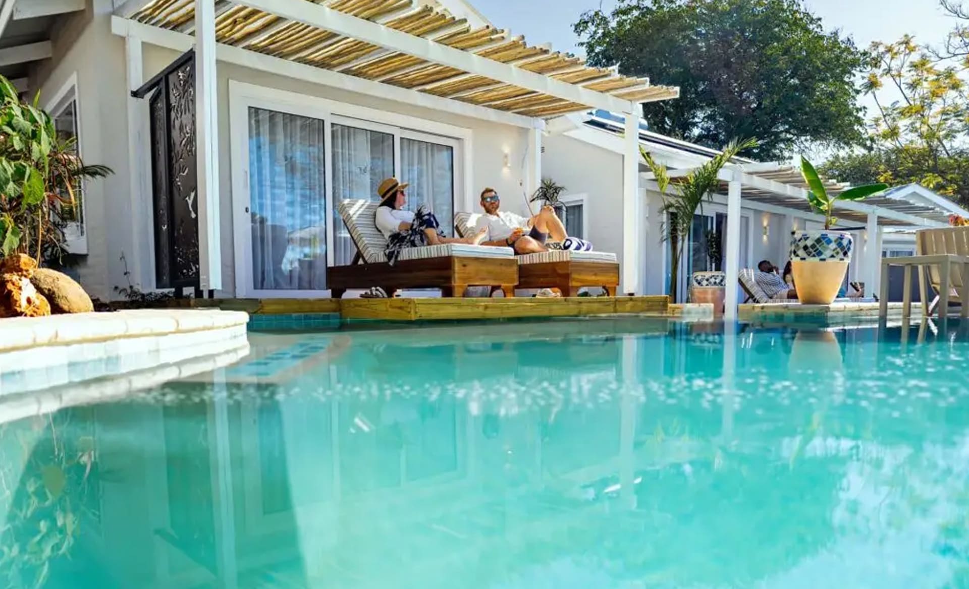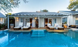 Samanzi is a uniquely designed hotel featuring fifteen cabana-styled rooms built around a series of turquoise pools. The ensuite rooms feature indoor-outdoor showers and direct access from your patio to one of the eight pools. Enjoy meals at the onsite restaurant or a cocktail poolside (or at the swim-up bar). Located in the heart of Victoria Falls, Samanzi is a delightful base for exploring or enjoying one of the many activities in town. Guests have access to the Shongwe Lookout, which offers stunning views of the mist from the Falls and sunsets.