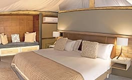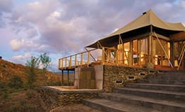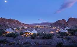 Located in a private reserve just a 3.5 hour drive from Cape Town, Sanbona Dwyka Tented Lodge offers a unique wildlife experience within the arid landscape of South Africa's Little Karoo. The tented lodge is situated within a ravine among striking rock formations. Each of the 9 luxury tents have private decks with heated plunge pools, en0suite bathrooms with both shower and bath, outdoor shower, heating and cooling, and minibar. The common area features a spa, open-air dining boma, lounge and wine cellar.