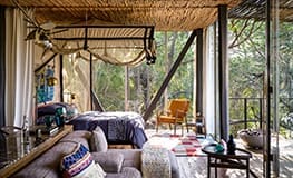 Singita Sweni shares the quiet spaces and secrets of an African waterway, in the dappled shade low on the banks of the Sweni River. With a style that is distinctly African, Singita Sweni unites earthenware pots and ethnic artworks with contemporary pieces, against a dark palette lifted with flashes of lime, avocado and kiwi. Built on stilts with decks of dark timber, Sweni Lodge is the smallest and most taciturn of the Singita lodges, with six supremely luxurious hides tucked away among the trees.