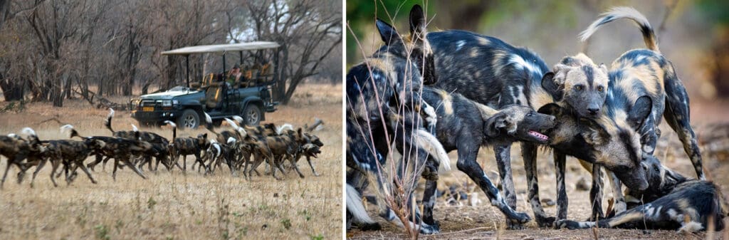 Blade has a wealth of knowledge and a real eagle eye for spotting wildlife. The drive from the remote airstrip to our camp was 2 hours. Within the first 20 mins we saw our first elephant using its trunk to reach high in the tree for leaves. We would later have multiple close encounters with elephants that varied from 5’ – 40’ from them! After gawking for a few minutes, we pressed onward as Blade heard reports of a rare dog pack further down the road and we wanted to see them before it got dark.