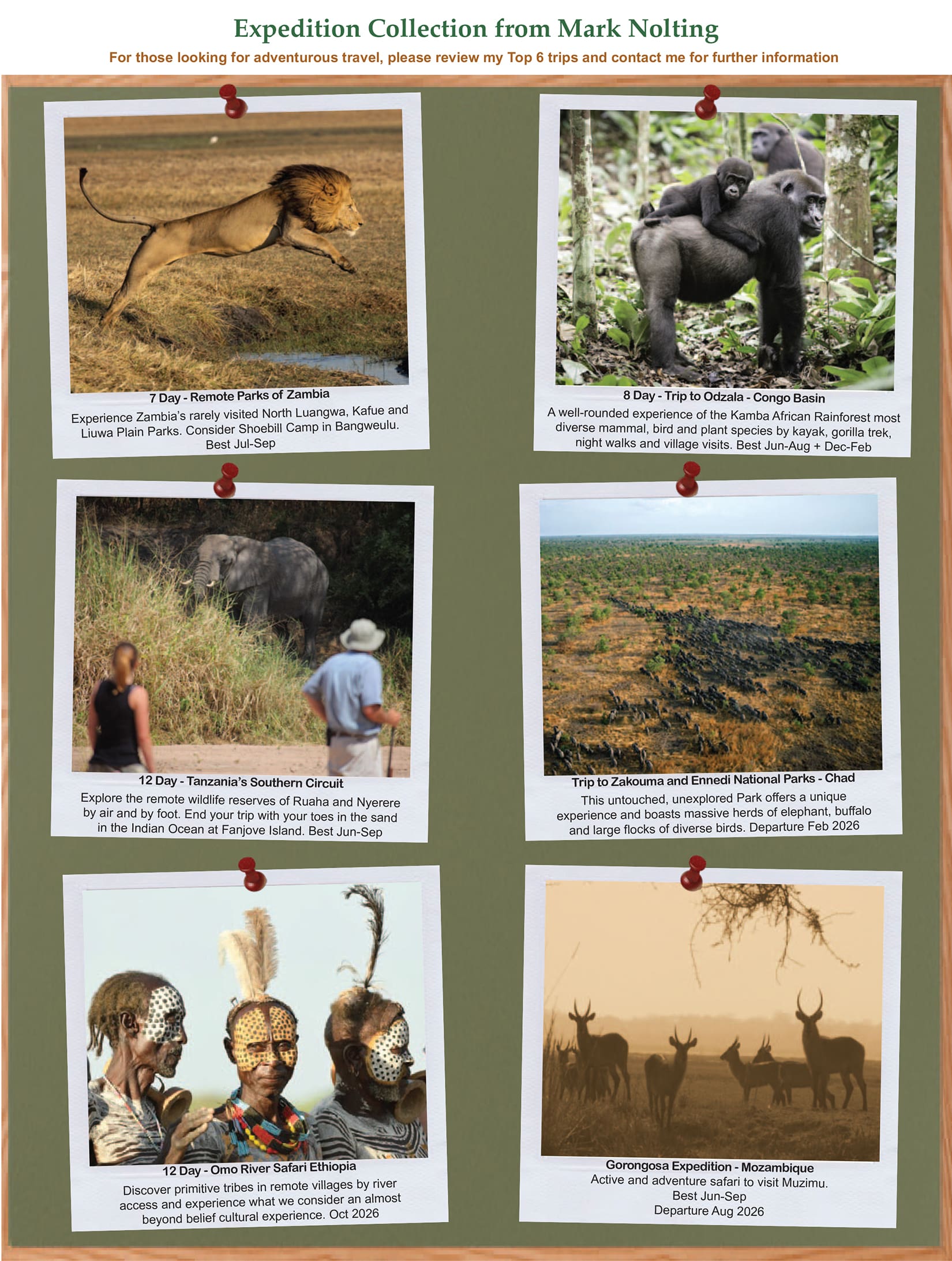 For those looking for adventurous travel, please review my Top 6 trips below and enquire which trip would you like more information.