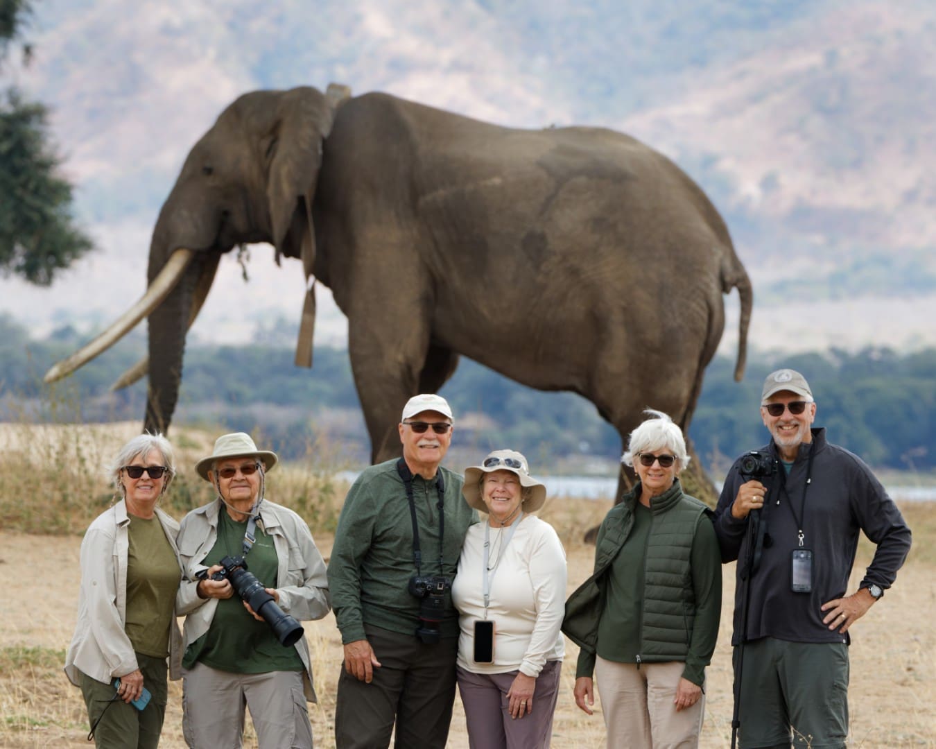 First Place – Clients on Safari – The Carl Hagen group in Mana Pools with Boswell in the background. Boswell did not disappoint with multiple two leg stands while getting high branches from the trees. Little Vundu, Mana Pools, Zimbabwe.