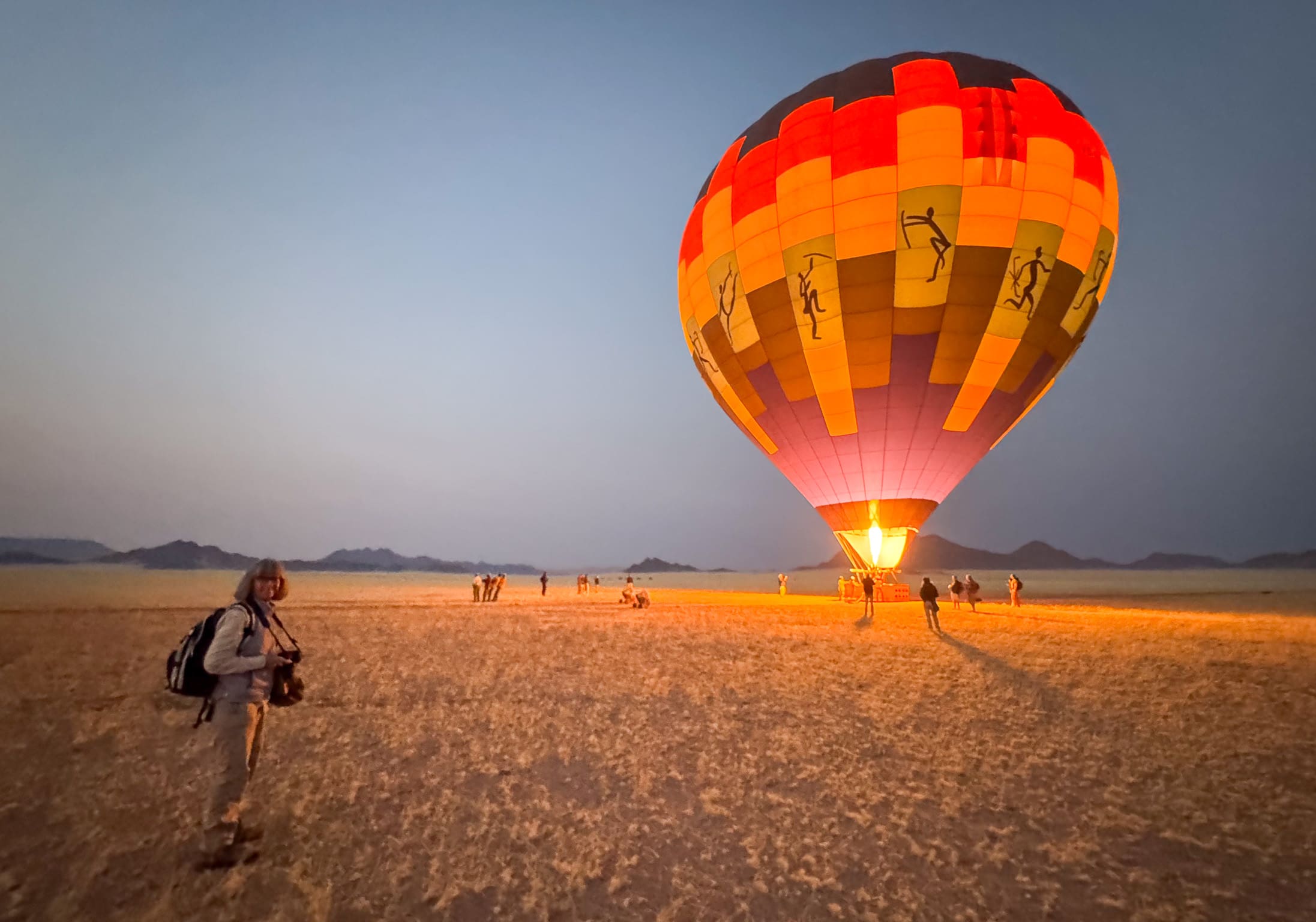 Third Place – Clients on Safari – Helen Reinhardt arrives at the Namibia balloon launch site in the dark. As the flames heated the air to fill the balloons, they glowed from within like lanterns.