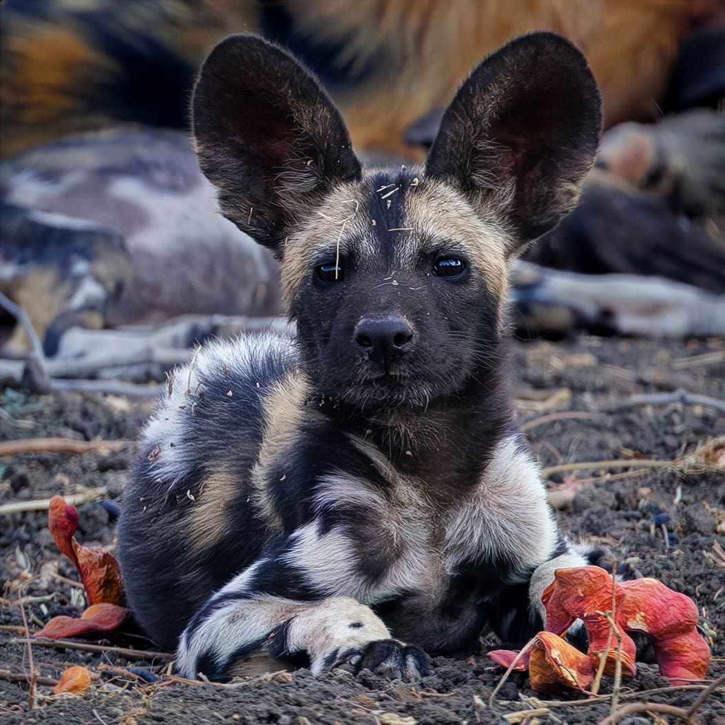 First Place Babies: Bill Armstrong – ‘Painted Puppy and Pods,’ An African Wild Dog puppy sitting amongst Winterthorn Tree pods it had been using as toys. Lower Zambezi National Park, Zambia.