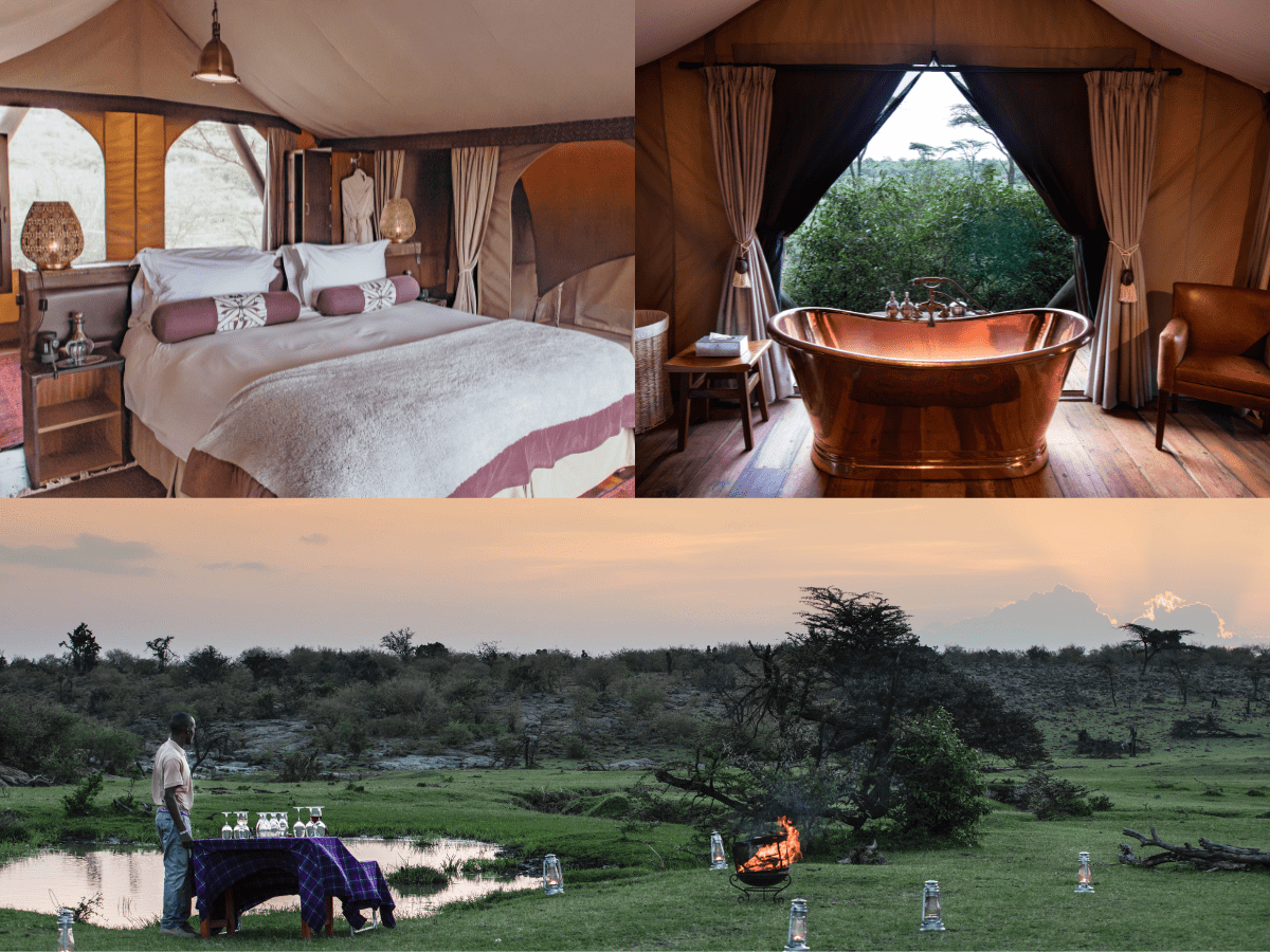 “What a first-class operation! The ambiance at Mara Nyika creates such a special, authentic safari experience. No detail is overlooked. From the leather stools utilized for bush breakfasts and sundowners, to the exotic, luxurious furnishings in the “tents”, to the bath-tubs with a view, we were in awe of our surroundings. The staff could not be more welcoming and kind. The dining experience includes beautifully-presented, delicious cuisine in gorgeous settings that change, meal by meal, evening by evening. If your idea of paradise, like mine, includes lots of lanterns flickering in the dark, as you sip sparkling wine at a candle-lit table set with beautiful china and silver (being waited on as if you were royalty), and listening to lions calling in the black distance, this camp is the place for you!”